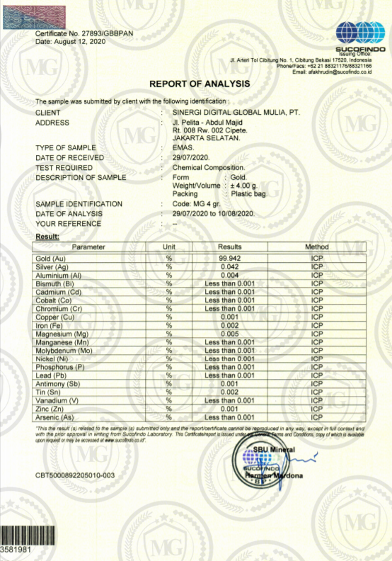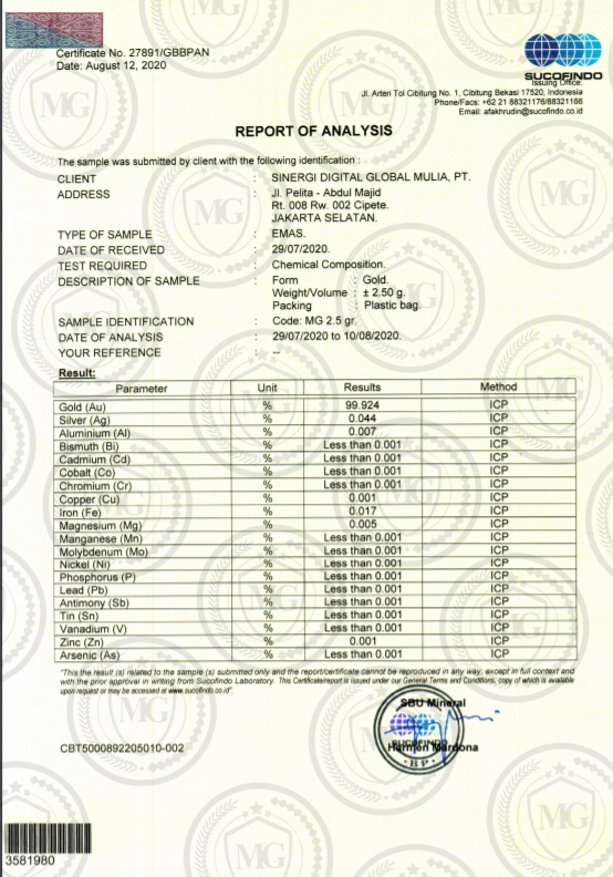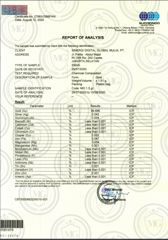 Kadar emas yang ia miliki 24 karat dalam Standar Nasional Indonesia adalah 99,1% – 99,9%. MiniGold adalah logam 24 karat tentu dengan hasil uji melebihi angka standar tersebut. Sucofindo adalah sebuah BUMN Indonesia yang bergerak dalam bidang pemeriksaan, pengawasan, pengujian, dan pengkajian. Berikut adalah hasil uji lab MiniGold yang membuktikan bahwa MiniGold adalah Logam Mulia 24 karat.